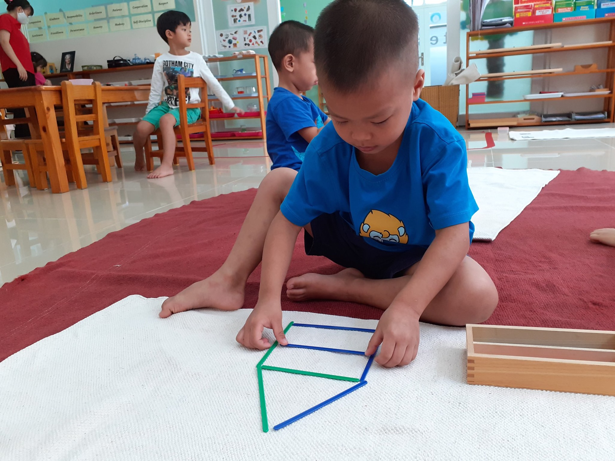 - Grace and Courtesy – learning how to speak or interrupt politely, apologize, not disrupting other people’s work, returning work on the shelf when finished, setting out lunch tables, etc.